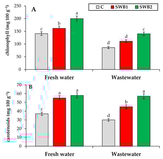 Wastewater significantly minimized the synthesis of photosynthetic pigments, on the other hand, the application of SWB significantly enhanced the synthesis of photosynthetic pigments (Figure 2A,B). The irrigation of quinoa plants with wastewater reduced the total chlorophyll and carotenoids by 27 and 12% in comparison with freshwater. The application of SWB1 increased the total chlorophyll and carotenoids by 38 and 49% in the case of freshwater, while these increments were 61, 29, 42, and 50% in the case of wastewater. SWB2 addition increased the total chlorophyll and carotenoids by 44 and 57% in the case of freshwater, while these increments were 67 and 90% in the case of wastewater.