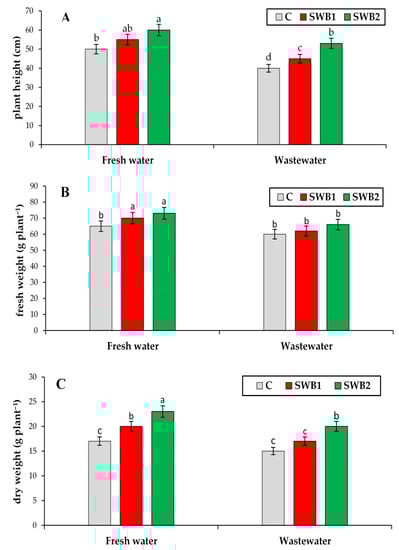 Effect of shrimp-waste-derived biochar (SWB) rates in the growth of quinoa. C, SWB1, and SWB2 are 0, 1, and 2% (w/w) of biochar. (A) plant height, (B) fresh weight, and (C) dry weight. Means (±SD, n = 5) with different letters indicate significant differences.