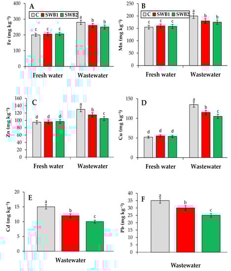 Iron (Fe), manganese (Mn), zinc (Zn), copper (Cu), lead (Pb), and cadmium (Cd) in the leaves of quinoa plants were affected significantly by the wastewater treatment (Figure 4A–F).