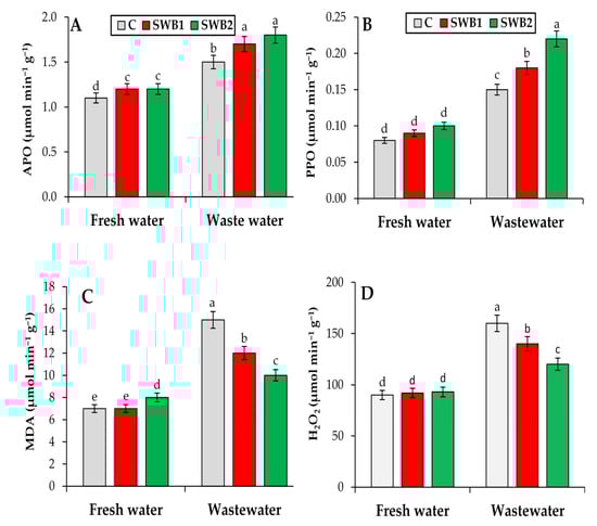 The addition of SWB to the quinoa plants that were receiving wastewater irrigation increased the activity of antioxidant enzymes such as APX and PPO (Figure 6). The decrease in heavy metal content in the quinoa shoots brought on by the addition of SWB may account for the increase in antioxidant enzyme activities. Quinoa plants stimulated the activity of antioxidant enzymes to mitigate the oxidative stress caused by the heavy metal toxicity in the wastewater. The toxicity of heavy metals in the wastewater increased the MDA and H2O2 concentrations in quinoa plants due to the oxidative stress caused by the heavy metals [,].