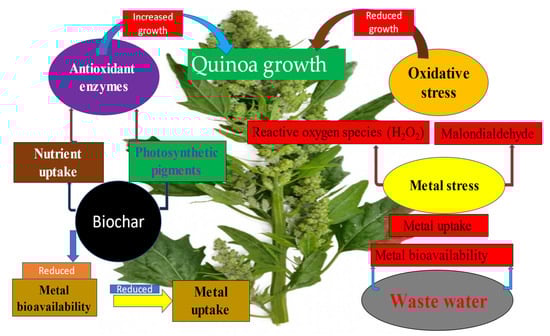 Toxic metal contamination of soils and water is a major concern, causing stress and toxicity in plants and, ultimately, a loss in yield and food quality [,]. He et al. [] reported that pollution with heavy metals may lead to losses in the global economy estimated at 10 billion dollars per year. Heavy metals are non-degradable in soil, fast-moving, highly toxic, and easily absorbed by plants; therefore, they are capable of causing damage to the growing crop, as they negatively affect the quality of the food produced from this crop [,]. Dealing with the problem of heavy metal pollution has become more urgent because of the rise in food demand brought on by population growth []. Lack of freshwater resources forces farmers in some parts of the world to irrigate crops with wastewater, which can contaminate the soil and introduce heavy metals into the food chain [,]. It is necessary to study the crop’s resistance to contamination with heavy metals and the places where these elements gather in plant tissues to know the extent of the danger to human health [,]. Reactive oxygen species (ROS) appear under metal stress, causing a harmful effect on plant cells and a reduction on plant growth []. Different defense mechanisms are used by plants to protect themselves from ROS []. The antioxidant system in plants is one of the most important ways that plants use to reduce the negative effects of ROS in in their cells []. Enzymatic and non-enzymatic compounds are the two major systems that make up the antioxidant defense [,]. Plant cells secrete many antioxidant enzymes such as ascorbate peroxidase, pyrogallol peroxidase, and polyphenol oxidase, whereas non-enzymatic antioxidants include phenolic compounds, glutathione, proline, and soluble carbohydrates []. The cultivation of halophytes e. g., quinoa plants in saline soils and using wastewaters may be considered as the most suitable and promising approach to deal with food security [,].