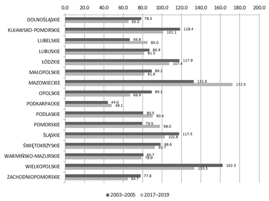 A comparison of individual years from the initial and final period may include a significant number of random elements; a more objective picture may be obtained by using averages from several years. When we use the three-year average, there were 7 voivodeships below the average in the initial period, whereas in the final period, the number of voivodeships decreased to 6. The average gross value added per person employed in relation to the country in 2003–2005 was: 120.5 ± 59.7 and increased in 2012–2014 to the level of 121.2 ± 60.4. The largest increase was recorded in the Mazowieckie Voivodeship (48.9 points), Pomorskie Voivodeship (33.4), and Podlaskie Voivodeship (31.9), and the largest decrease in Śląskie (−4.3), Dolnośląskie (−30.0) and Lubuskie Voivodeships (−21.4). The average increase was 0.7, i.e., 0.6% (Table 3).