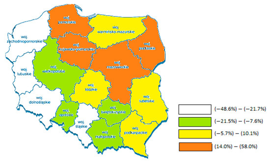 The median of change was −3.4%, which indicates that half of the studied voivodeships recorded a drop in the analyzed indicator by 3.4 pp, from 122.1% to 117.6%. In eight voivodeships, there was a reduction in the GVA/PE in relation to the national average, and in eight, there was an increase in this indicator. In relative terms, the largest relative regress in relation to the average was recorded in the Śląskie (−36.8), Małopolskie (−34.5), and Podkarpackie Voivodeships (−30.6), while the largest increase was recorded in the Mazowieckie (+42.6), Pomorskie (24.6), and Podlaskie Voivodeships (+39.9) (Figure 1).