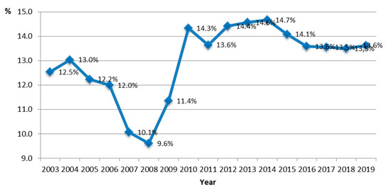 Figure 4 shows the analysis of sigma-convergence/divergence for all regions using the course of changes of the coefficient of variation of the relative value added per person employed in section A in 2003–2019. Four phases can be distinguished from the course of the curve, illustrating changes in the coefficient of variation in the analyzed period: convergence, divergence, and stagnation. Initially, in the analyzed period between 2003 and 2008, the coefficient of variation decreased from 12.5% to 9.6%, which coincides with the first stage of support for Polish agriculture from the EU budget. This period can be treated as the time in which the convergence of voivodeships occurred. In the second stage (2008–2010), an increase in the coefficient of variation of the GVA/PE from 9.6% to 14.3% occurred. This proves the deepening of differences between regions, as a result of which, within two years, the differences between the examined voivodeships increased to a level exceeding the initial value from the period before Poland acceded to the EU. This trend resulted partly from the global financial crisis in 2007–2010. The third period under consideration, namely 2010–2014, except for 2011 when a positive change occurred, was characterized by stability at a high level of variability of 14.3–14.7%. This period can be called a period of “stagnation”—or a time in which the differences between the regions did not increase, but also did not decrease. The next phase of convergence occurred in 2014–2016 (with a decrease from 14.7% to 13.6%); the next period of stagnation returned in the fourth period, at the level of 13.5–13.6%. Figure 4).