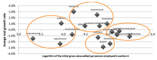 Beta (fi) convergence will be evaluated further in this paper. Figure 5 presents the characteristics concerning the level of dependence between the average productivity growth rate in individual voivodeships (vertical axis) and their initial levels (horizontal axis). It can be noticed that the poorest regions of fragmented agriculture (Podkarpackie, Małopolskie, and Świętokrzyskie Voivodeships), as well as the industrialized regions (Śląskie and Dolnośląskie), recorded relatively low growth, not exceeding 4%. On the other hand, Zachodniopomorskie, Wielkopolskie, and Lubuskie Voivodeships recorded average increases of 4–7%. The Podlaskie and Mazowieckie Voivodeships showed the highest increases, while the Śląskie and Małopolskie Voivodeships showed the lowest. The above analysis does not indicate the occurrences of absolute beta-convergence of voivodeships in 2003–2014. Regions with lower labor productivity did not develop faster than the regions with medium and high levels of GVA/PE.
