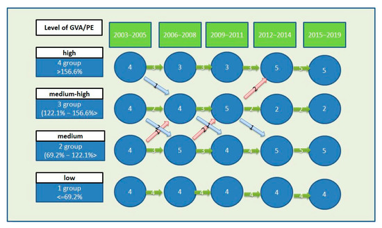 In 2019, all four voivodeships, which in 2003 belonged to the first complex, kept their lowest positions in labor productivity. Two out of four voivodeships with the highest GVA/PE values in 2003 kept their positions in group four, which constituted 25% of voivodeships having the highest labor productivity. These were the voivodeships: Zachodniopomorskie (201%) and Warmińsko-Mazurskie (185.5%). The GVA/PE in Lubuskie and Wielkopolskie decreased by −21.7% pp and −8.3 pp parallelly, which resulted in moving these regions to the third group. Their earlier positions were replaced by Pomorskie and Mazowieckie Voivodeships, which noted spectacle increases in labor productivity. Łódzkie and Opolskie Voivodeships remained in the second group, Podlaskie advanced from the second to the third group, while Dolnośląskie and Śląskie noted the highest decrease by −48,3 pp from the third to the second group (Table 4).
