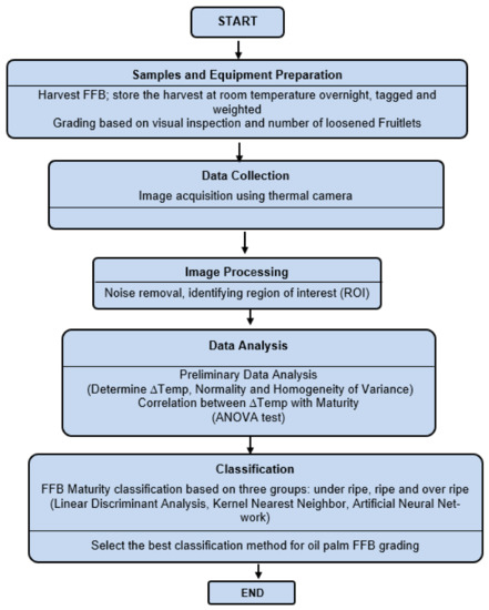 The images of oil palm FFB collected using the thermal camera were processed to identify the temperature distributions of the selected areas on the FFB. The main steps of this process are outlined in the following sections.