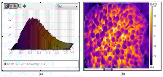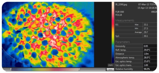 The ThermCAM Researcher Pro software proposed for thermographic processing allows the user to choose any ROI irrespective of its geometric shape. This software has a segmentation algorithm that is based on the thresholding segmentation method. The given method is the most accurate and precise algorithm for this purpose. The segmentation algorithm tends to optimize the selected region via the removal of those areas that do not have relevant statistical data. As a result, the temperature of the ROI was considered (Figure 6).