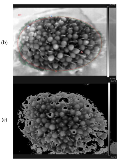 Visual investigations have demonstrated that fixed thresholding is able to remove low-intensity regions. Border identification of fruits plays a key role in determining the average temperature accurately. That being the case, boundary digitizing improves the accuracy of determining the average temperature of the FFB. This method was used for further and more detailed characterization (Figure 7).