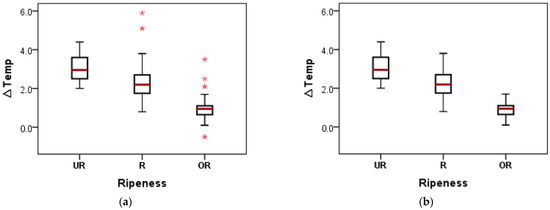 Box and whisker plots represent the ∆Temp of under-ripe, ripe, and over-ripe oil palm FFBs. (a) samples with outliers, (b) clean data, *: outlier samples.