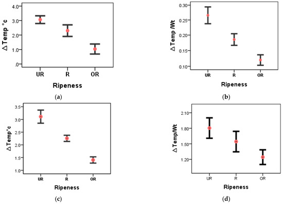 The results obtained from the statistical analysis indicated that the content of ∆Temp in oil palm FFB tends to decrease with the maturity stage. The bunches at the under-ripe stage turned out to have the highest index value for the parameters of ∆Temp (Figure 10). Following that, the index value underwent a decrease as the bunches ripened and decreased further when the bunches became over-ripe.