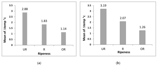 Mean values of ∆Temp based on different ripeness categories: (a) first experiment, (b) second experiment.