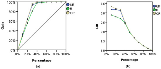 ANN performance measurement (a) cumulative gains chart (b) lift chart.