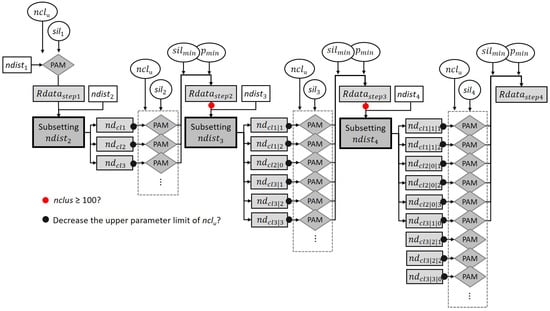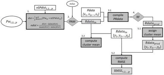 - PAM clustering is conducted on the normalized distance matrix (ndist) with nclus = 8, 9, …, 100. The nclus minimum value was selected according to Ließ et al. [4]. For each input parameter vector including Pw1, Pw2, Pw3, …, Pwp and , the best cluster solution is selected on behalf of the Silhouette Index.