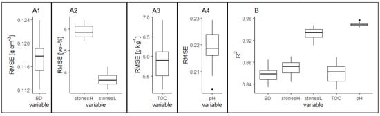 The modifications in the horizon sequence notation in dataL and dataF resulted in data gaps concerning all laboratory or field data of a certain depth interval. Further, using interpolation methods to fill these gaps may not be the best option due to the geological stratification, i.e., discontinuities in the soil profiles. In addition, the data gaps relating to the uppermost and last soil horizon cannot be filled in this way. Therefore, the following procedures were applied: The resulting texture data gaps in dataL were filled by additionally considering texture data from dataF. The mean value of the sand, silt and clay content (dataL) from other horizons with matching texture classes (dataF) was used. This happened stepwise. If the prerequisites were met, only data from the same profile were used. Otherwise the complete dataset’s respective class-wise mean values were assigned. Finally, the remaining texture classes were filled by the KA5 texture class’s mean sand, silt, and clay content. The latter corresponds to layers with uncommon soil texture classes and hence too few data entries (less than five). For data gaps in the TOC of organic soil horizons, a similar approach was followed considering horizon symbols and organic texture classes. For TOC in the mineral soil horizons, as well as the pH, bulk density and stone content of all horizons, random forest (RF) models were trained. Model training, tuning, and evaluation were conducted with nested stratified cross-validation (CV), as explained in Section 2.3.2. As predictors, the same property’s values from upper and lower horizons as well as related soil properties of over- and underlying horizons were used. Related properties of the same horizon could not be used unless for those where dataF was used to fill gaps in dataL.