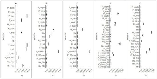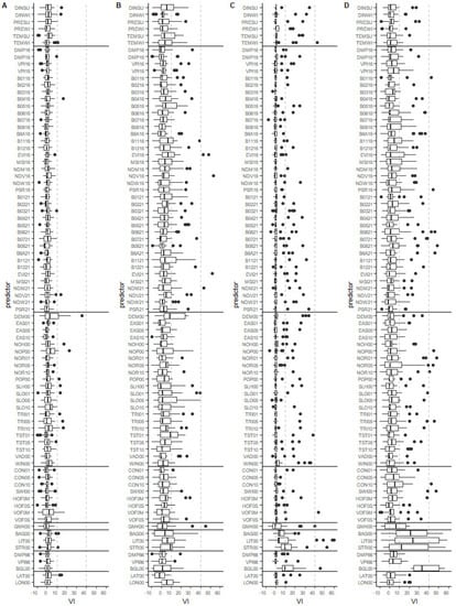 Variable importance (VI) boxplots of the models for SPU regionalization. (A) RF–PAMp, (B) RF–PAMm, (C) SVM–PAMp, and (D) SVM–PAMm. The horizontal lines separate the respective predictor groups corresponding to the SCORPAN factors: climate, organisms, relief (topography), relief (hydrology), relief (categorical), parent material, soil, and latitude and longitude. Please refer to Table 1 for the predictor abbreviations.