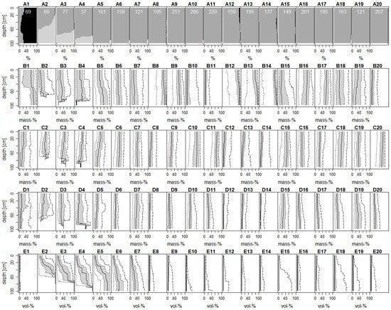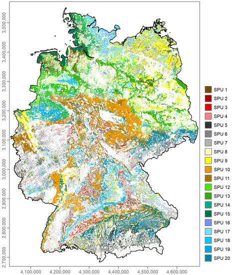 Overall the number of SPUs increased from 8 to 20 in comparison to Ließ et al. [4], providing a more detailed spatial differentiation. The previous single SPU with a high stone content and a depth limitation in the top 100 cm is now augmented to six SPUs with a high stone content, of which three additionally have a depth limitation in their top 100 cm. The two SPUs with stagnic and two with gleyic properties were augmented to four and five, respectively. The SPUs with a predominantly sandy or silty texture were augmented from one SPU to two SPUs in both cases. Simply, the SPU including soils with organic horizons remained only one, another hint to consider the separate differentiation into SPUs for the all-mineral and partly mineral soils.