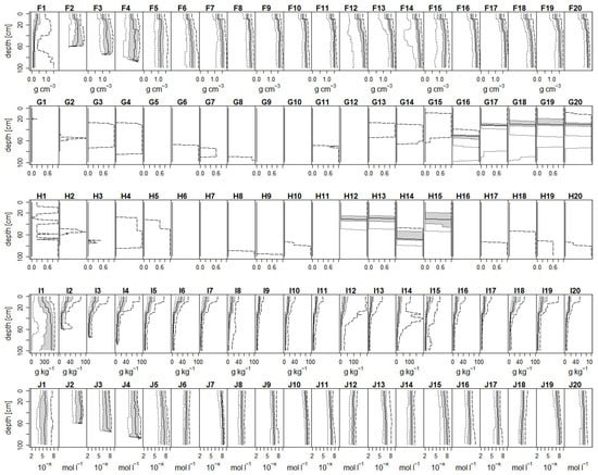 The sampling protocol for the Agricultural Soil Inventory states that samples for subsequent laboratory analysis ought to be taken for the depth increments 0–10, 10–30, 30–50, 50–70, and 70–100 cm while taking into account horizon boundaries, i.e., including multiple samples per depth increment for each corresponding soil horizon present with five or more centimeters [31]. However, as could be expected for such a large soil survey campaign involving multiple teams, the dataset contains some inconsistencies. To combine dataF and dataL, the two datasets were checked for mismatches in absolute profile depth and horizon sequence notation (term used for dataF and dataL), as well as non-compliant data entries, duplicates or gaps in the horizon sequence notation. After correcting non-compliant data entries, the next correction step concerned the mismatches in profile depth and horizon sequence notation. For their correction, I tested whether mismatches concerning depth and horizon sequence notation corresponded to additional layers (or horizons) and whether the difference was minor, up to 5 cm, i.e., mismatches in line with the sampling protocol. After adjusting the layer boundaries accordingly, all other mismatches were corrected stepwise by favoring the profile depth of dataF over dataL in case the difference was not caused by additional layers (or horizons), and by splitting layers of dataL if they included one or more horizon boundaries that differed from the upper or lower layer boundary by five or more centimeters. This procedure resulted in matching horizon sequence notation and profile depth between dataF and dataL, and the two datasets were combined using the profile identifier. From now on, these joint depth divisions will be referred to as horizons.