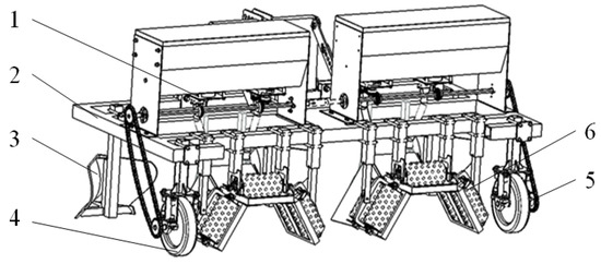 Schematic diagram of the overall structure of furrow-up fertilizer applicator. 1. Fertilizer apparatus; 2. Rack; 3. Furrower; 4. Ground wheel; 5. Transmission device; 6. Suppression device.