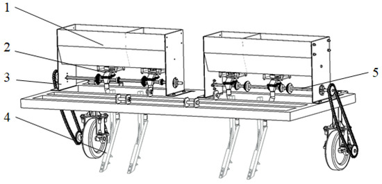 The fertilizer apparatus is mainly composed of a fertilizer box, a support plate, a vertical variable cavity fertilizer discharge device, a fertilizer delivery pipe, a fertilizer discharge shaft, and fertilizer boots (Figure 2).