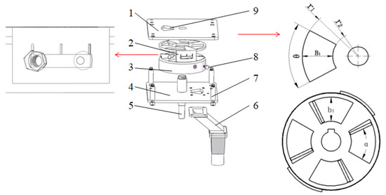 Structure of vertical variable cavity fertilizer drainer. 1. The upper board; 2. Cavity regulator; 3. Fertilizer disk; 4. The bottom board; 5. Rotary shaft; 6. Fertilizer pipe; 7. Support column; 8. Set screw; 9. The filling orifice of fertilizer disk. Note: B1 is the width of the fertilizer opening of the organic fertilizer box, in mm; r1 is the outer radius of the filling orifice, in mm; r2 is the inner radius of the filling orifice, in mm; θ is the maximum opening of the fertilizer disk, in °; b1 is the width of the fertilizer opening of the organic fertilizer discharge disk, in mm; α is the opening degree of the fertilizer discharge tray, in °.
