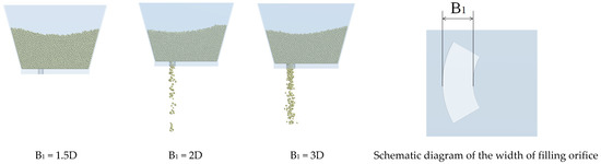 Combining the above expressions and substituting relevant data, the value of B1 was 18.46 mm. The theoretical calculation results were verified by EDEM discrete element simulation analysis. A simple model of fertilizer boxes was established and imported into the EDEM. The selection of the B1 width was based on the average diameter, D, of the fertilizer particles applied. We selected 1.5 D, 2 D, and 3 D for simulation experiments (Figure 4). The simulation results demonstrated that when the B1 width was 1.5 D, the fertilizer particles were barely discharged from the fertilizer box and could not work normally. At 2 D, the fertilizer began to drain from the box, but it was intermittent, with poor stability and uniformity. At 3 D, the fall of fertilizer was relatively uniform and stable. Overall, these findings were similar to the circular filling orifice designed in this paper, and a relatively uniform and stable fertilizer discharge was achieved when the radius was 60° and its width was three times or more that of the diameter of the applied fertilizer particles. The diameter of the organic fertilizer particles ranged from 3–6 mm, and the B1 should be larger than 18 mm. The simulation results were close to the theoretical analysis results, which verified the correctness of the principle of preventing arch formation.