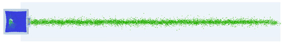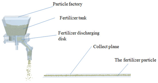 First, a particle factory at the upper end of the fertilizer box was established, and the particle generation rate was set to 10,000 per second, with a total of 30,000 articles. The rotational speed of the fertilizer disk was set to 30, 60, 90, 120, and 150 rpm. Then, a long plane was set at a distance of 100 mm from the bottom of the fertilizer discharging device, and the set plane moved backward at a speed of 0.6 m/s to simulate the forward movement of the fertilizer discharging device in the actual fertilizer discharging process. After all fertilizer particles were generated, the fertilizer removal device and the ground began to move, and the real fertilizer removal process was simulated to make the simulation results more realistic.