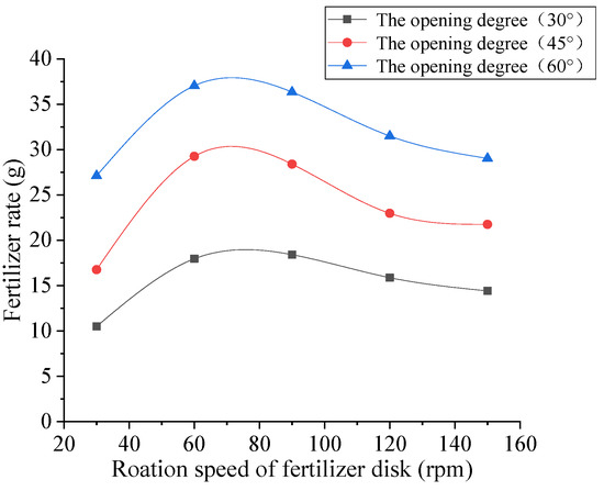 According to the simulation test method, after the simulation, the quality of the fertilizer particles in the sampling area under different opening degrees and different speeds was counted (Figure 6). The fertilizer discharge in the sampling interval initially increased and then decreased with increasing rotational speed. This occurred because when the rotational speed was too high, the filling coefficient of the fertilizer cavity decreased, and the fertilizer discharge ability of the fertilizer disk gradually decreased with a continuous increase in the rotational speed. The fertilizer discharge rate of a single rotation obtained by the simulation was 36–74 g, which met the demand of the fertilizer application rate.