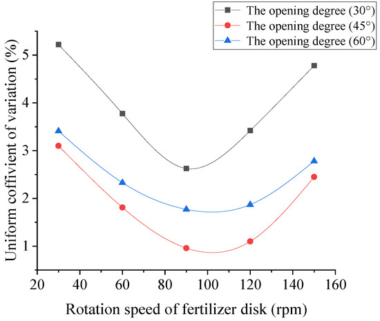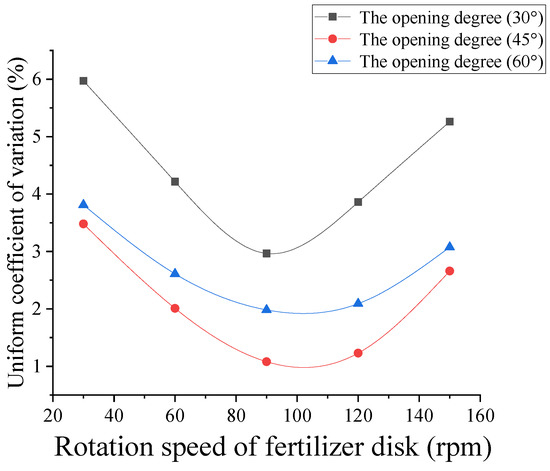 Variation of coefficient of variation of fertilizer discharge with rotational speed under different opening degrees.