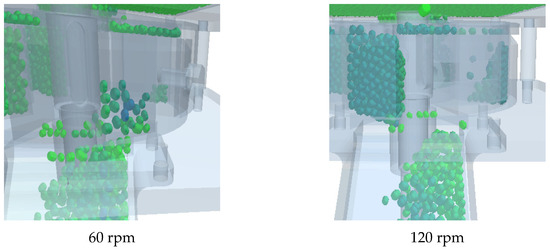 Particles remaining in the cavity after rotation speeds of 60 rpm (left image) and 120 rpm (right image).