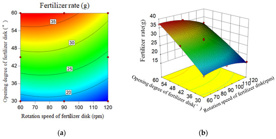 Relationship between fertilizer application rate and the rotation speed and opening of fertilizer disk. (a) Contour map; (b) Response surface.