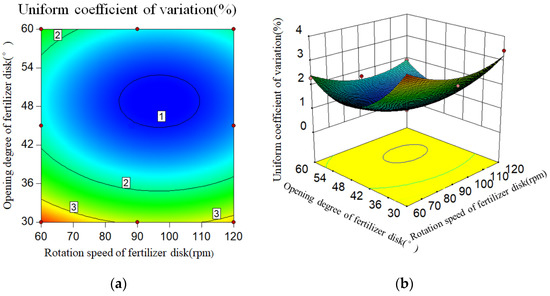 According to the experimental results, the relationship diagram of the influence of rotation speed and opening degree on the variation coefficient of fertilizer application rate and fertilizer discharge uniformity was drawn. As shown in Figure 10, the isometric plot and response surface of fertilizer application rate increased with increased opening, when the rotation speed was constant. When the opening degree was fixed, the fertilizer application rate increased slightly at first, and then decreased with an increase in the rotation speed. Comparing the effects of the two factors on fertilizer application rate, the slope of the curve of the change curve of fertilizer application rate with the opening rate was larger than the change curve of fertilizer application rate with rotating speed. Therefore, the effect of the opening rate on fertilizer application rate was greater than that of the rotating speed. The maximum value of fertilizer application appeared at 60° and 87 rpm.