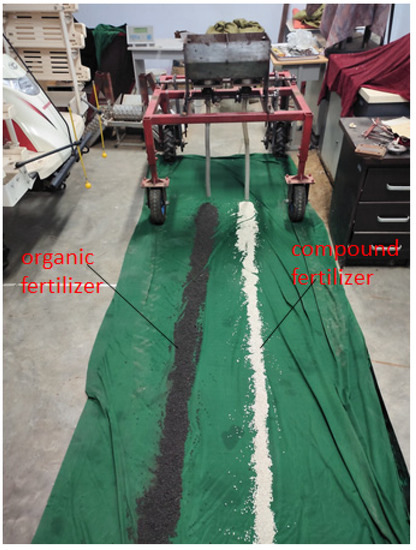 A physical model of a fertilizer discharging device was made and a platform was built for the fertilizer discharging test, as shown in Figure 12. A servo motor was used as the power source to drive the platform and the fertilizer discharging device. A layer of soil was laid flat on the ground to simulate the contact between fertilizer and soil during normal fertilization operation, and a thin layer of cotton cloth was set on the soil to collect fertilizer particles. The platform discharging test was carried out according to the process of the simulation discharging test. High carbon-based organic fertilizer and potassium sulfate compound fertilizer were used as test objects and the opening of the fertilizer disk cavity was adjusted. A speed test was performed multiple times to collect and weigh the fertilizer plant for statistical analysis. Each group was repeated 10 times and the distributing uniformity coefficient of variation was calculated.