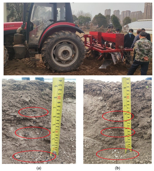 To further verify the reliability of the designed fertilizer apparatus, a prototype of a furrow-up fertilizer applicator was made for a field experiment in the Science and Education Park of Henan Agricultural University (Figure 14). The power was provided by a four-wheel-drive tractor of the Dongfanghong Agricultural Machinery LX904. The basic physical properties of the soil were measured, and the average soil water content was 18.06%. The average speed of the tractor in the experiment was 0.6 m/s, the rotation speed of the fertilizer disk was 90 rpm, and the cavity opening of the fertilizer disk was 45°. It was difficult to collect the fertilizer, because it was applied directly into the soil. In this experiment, the soil profile was taken after the fertilization operation, and the fertilizer was weighed and counted after the soil was removed. The results are shown in Figure 15.