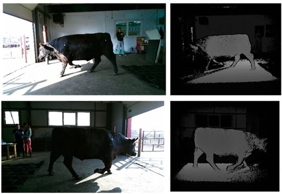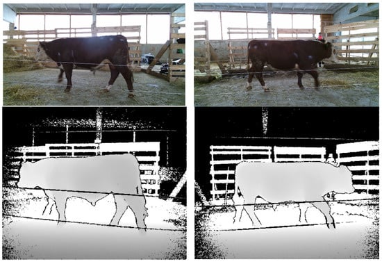 Figure 1 shows RGB images and depth maps of cattle taken with two Microsoft Kinect cameras. In experiments, RGB images and depth maps were used on the right and left sides separately. The complete dataset consists of 5220 RGB images and 5220 depth maps on the right side, and 4620 RGB images and 4620 depth maps on the left side.