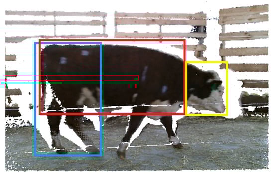 35] was used to detect several regions of different sizes in one 2D image, and the model was further trained to detect areas of the head, thigh, and body of an animal in a 2D image. The presence of three areas of the body, thigh, and head of the animal uniquely defines the frame for the whole animal. As shown in