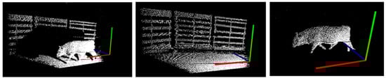 34]. Two Microsoft Kinect v2 cameras are located on the right and left sides of the animal passage at a distance of about 2 m from the walking animal. Each depth camera was connected to a laptop, and all laptops were connected to a local network. The synchronously acquired RGB-D images were recorded on the respective laptop for each camera. Data collection and storage were implemented based on the Kinect v2 SDK. Each camera was initialized with a trigger signal and started capturing frames at a rate of 30 Hz. The time on the laptops was synchronized, and the best point cloud match could be chosen within the shortest time intervals between the three devices. The resolution of RGB images and depth images is 1920 × 1080 and 512 × 424 pixels, respectively.