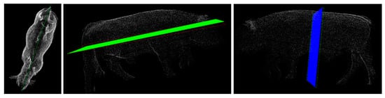 Symmetry lines are calculated for the entire cloud using the proposed method. Further, to align the cloud, using the found coefficients of the plane and the Cartesian basis of its own subspace, the pose of the animal is aligned parallel to the normalized plane OXZ.