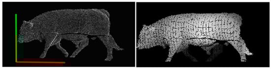 The following algorithm is proposed to calculate flat projections of point clouds. The cloud obtained at the previous step is transferred to the origin of coordinates (i.e., the extreme point of the parallelepiped into which the cloud is inscribed moves to the point (0, 0, 0)). Using the OpenCV library, an empty image of 299 × 150 is created in memory. The maximum parameters for the width and height of the animal are 2.5 and 1.35 m, respectively. All point coordinates of the cloud are normalized to the size of the image, and the x and y coordinates of the point from the cloud in the empty image are set to the z color value. The resulting image is saved in BMP file format.