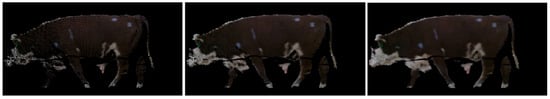 An important step in point cloud processing is to remove the background from the point cloud. Two point clouds are needed, that is, one cloud with a frame without an animal, and the other cloud with the animal. To do this, the entire sequence of frames obtained during recording is used to find a frame without an animal. Next, a point-by-point comparison of cloud points is performed. If the distance of the corresponding points in these clouds in three-dimensional space exceeds a specified threshold value, then the point is transferred to a new point cloud without background. An example of how the algorithm works with the threshold equal to 0.1 is shown in