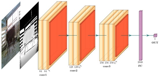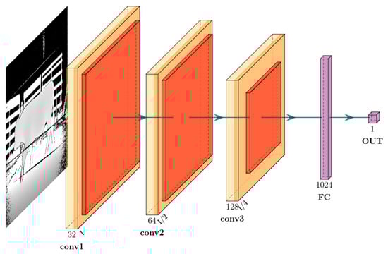 Figure 11, where only RGB images are input. The model contains 3 convolution blocks (con1, conv2, and conv3) and two fully connected layers (FC and OUT). The conv1 block has 32, 3 × 3 filters, the conv2 block has 64, 3 × 3 filters, and the last convolution block, conv3, has 128 3 × 3 filters. After blocks conv1, conv2, and conv3, subsampling layers with a kernel size of 2 × 2 are used. ReLU, which is not shown in