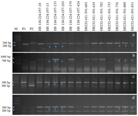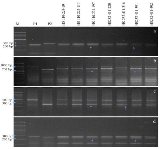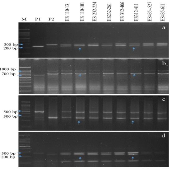 Figure 5. PCR amplification of submergence tolerance and bacterial blight resistant gene(s) in BC2F2. (a) Amplicons of the Sub1 using Sub1bc2 primer. (b) Amplicons of the Xa21 using pTA248 primer. (c) Amplicons of the xal3 using xal3prom primer. (d) Amplicons of the xa5 using RM122 primer; M, marker; P1, donor parents (Swarna Sub1, IRBB66); P2, recurrent parent, RP (Hasanta); Lanes 4-16 represent NILs (HS 110-224-197-10, HS 110-224-197-13, HS 110-224-197-135, HS 110-224-197-263, HS 110-224-197-379, HS 110-224-197-424, HS 232-411-391-603, HS232-411-391-619, HS232-411-391-702, HS232-411-391-735, HS 232-411-391-756, HS 232-411-391-809, HS 232-411-391-831); vertical arrows indicate positive plant homozygous/heterozygous for all targeted genes.