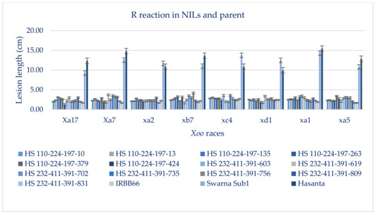 Furthermore, BB bioassay of NILs carrying three R genes confirmed the successful introgression of the R genes, and the lines manifested incompatible disease response against all virulent Xoo pathotypes considered in the study [2,4,15,39,42,49]. The improved lines with two or more effective R gene combinations showed resistance levels comparable to that of the donor, which validated the efficacy of the introgression strategy that followed [2,4,15,39,42,49].