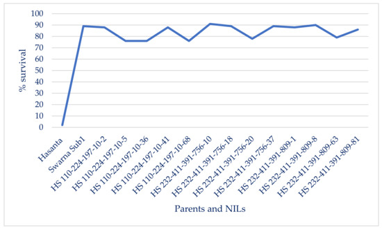 Figure 7. Survivability of introgressed lines (BC2F3 and BC2F4) under 14 days submergence [56].