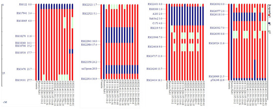 Target traits in F1, IC1F1 and BC generations were traced using trait linked-DNA markers, Sub1bc2 with 0.0 cm distant to Sub1 [2], pTA248 lying 0.2 cm distant to Xa21 [23,67], xa13prom with 0 cm distant to xa13 [13,44,55] and RM122 with 0.4 cm distance to xa5 [65] (Table 2). Moreover, genome recovery of the RP was monitored with 108 polymorphic SSR markers (Table 3 and Table S2) that uniformly span entire rice genome [13,34,68,69]. These 108 SSRs were selected from 421 SSRs based on the polymorphism survey between Hasanta and Swarna Sub1. Recombinant analysis was carried out using markers, Sub1-A203, and Sub1-C173 (Sub1); RM26969 (Xa21), RM23356 and RM22914 (xa13) and RM17941 (xa5) flanking the Sub1 and BB resistant genes on chromosome 9, 11, 8 and 5. The molecular data in the BC2F2 generation were used to visualize genotype of individual NILs using the Graphical Genotyper (GGT2.0) software [70].