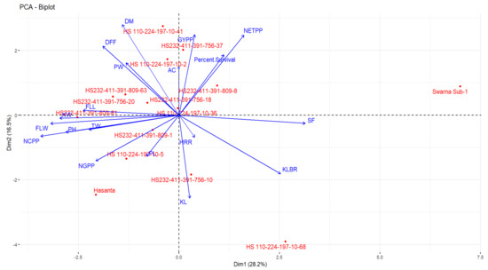 Figure 9. Biplot diagram of 19 traits including yield, quality and other agro-morphological traits in the parents and NILs.