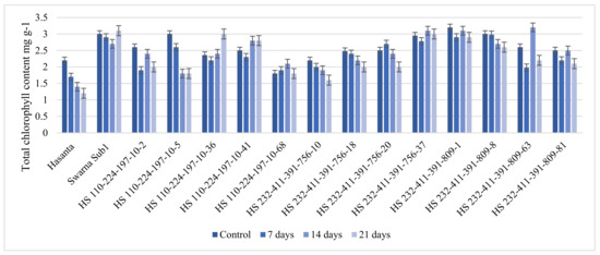The pyramided lines (BC2F4) along with parents were evaluated for physiological traits, such as total chlorophyll content, total soluble sugar, ADH activities and proline accumulation under 0, 7, 14 and 21 days of flooding regimes (Figure 10, Figure 11, Figure 12 and Figure 13, Table S6). The analysis of variance (ANOVA) for the RBD is given in Table 6. The variation among the NILs was higher for all physiological response studied in all submergence regimes. The total chlorophyll (Chl a and Chl b) content was measured in the leaf and culm of 60 days old plants after 7, 14 and 21 days of submergence (Figure 10). The result revealed that the maximum chlorophyll content was reported under control condition (ranged from 1.80 to 3.20 mg g−1) and it was highest in Sub1 carrying genotypes. It recorded a decreasing trend in proportion to the duration of submergence in all lines (parent and NILs) and regimes. The lowest value was recorded in RP (1.40 mg g−1) followed by in HS 110-224-197-10-5 (1.80 mg g−1) and HS 232-411-391-756-10 (1.90 mg g−1) after 14 days’ submergence. The result indicates fast depletion of total chlorophyll in intolerant cultivars. Notably, Swarna Sub1 along with HS 110-224-197-10-36, HS 232-411-391-756-37, HS 232-411-391-809-1 recorded comparatively increased level of chlorophyll content after desubmergence (i.e., 21 days).