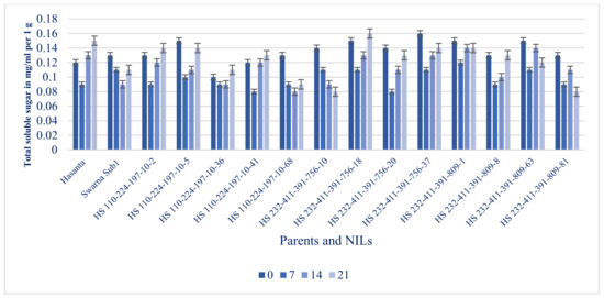 Figure 11. Total soluble sugar content in leaf under different submergence regimes (0, 7, 14, and 21 days).