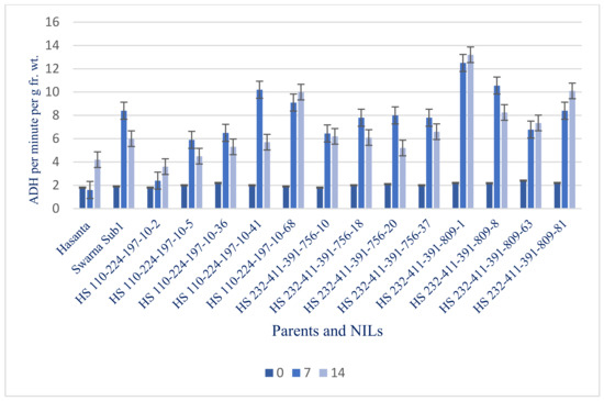 Figure 12. ADH activities in parents and NILs under different submergence regimes (0, 7, and 14 days).