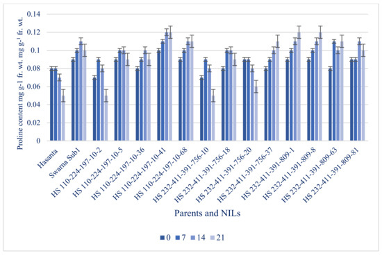 Figure 13. Proline content in parents and NILs under different submergence regimes (0, 7, 14, and 21 days).